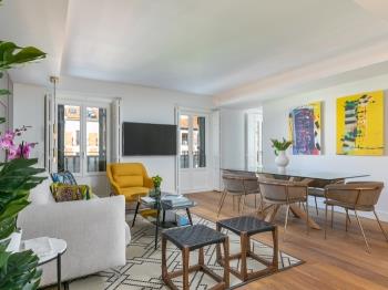 Con una decoración original y contemporánea, el mobiliario combina estilo y confort de manera excepcional. El ambiente se caracteriza por tonos neutros con toques de color que aportan personalidad a cada espacio, creando ambientes relajantes. La sala de estar/comedor incluye un sofá cama, suelos de madera que brindan una sensación acogedora, y una mesa de comedor para seis personas, ideal para comidas compartidas. La moderna cocina está completamente equipada y parcialmente abierta a la sala de estar. Destaca una elegante barra americana en tonos blancos que aporta distinción y diseño. Dispone de todos los electrodomésticos que los inquilinos puedan necesitar durante su estancia