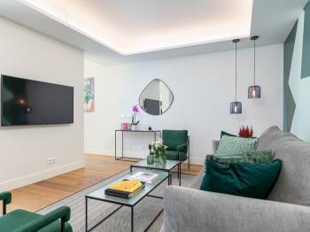 Spectacular 2-bedroom apartment in the Salamanca neighborhood, adjacent to Retiro Park. Featuring original and contemporary décor, the furnishings seamlessly blend style and comfort. Adorned in neutral tones with pops of color that infuse personality into each space, creating tranquil atmospheres. The living/dining area boasts a sofa bed, warm wooden floors for a cozy ambiance, and a dining table for six, perfect for shared meals. The modern kitchen is fully equipped and partially open to the living area, with a sleek white breakfast bar adding distinction and design. It comes complete with all appliances tenants may require during their stay.